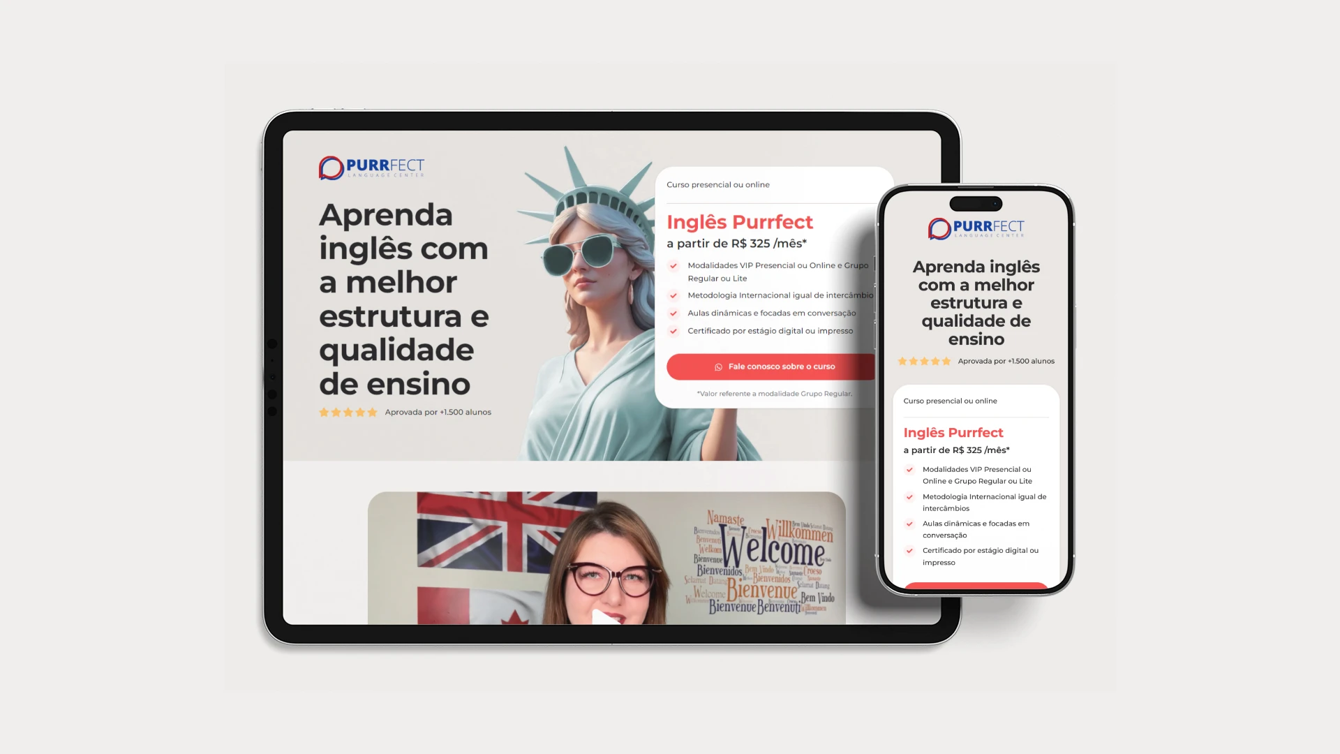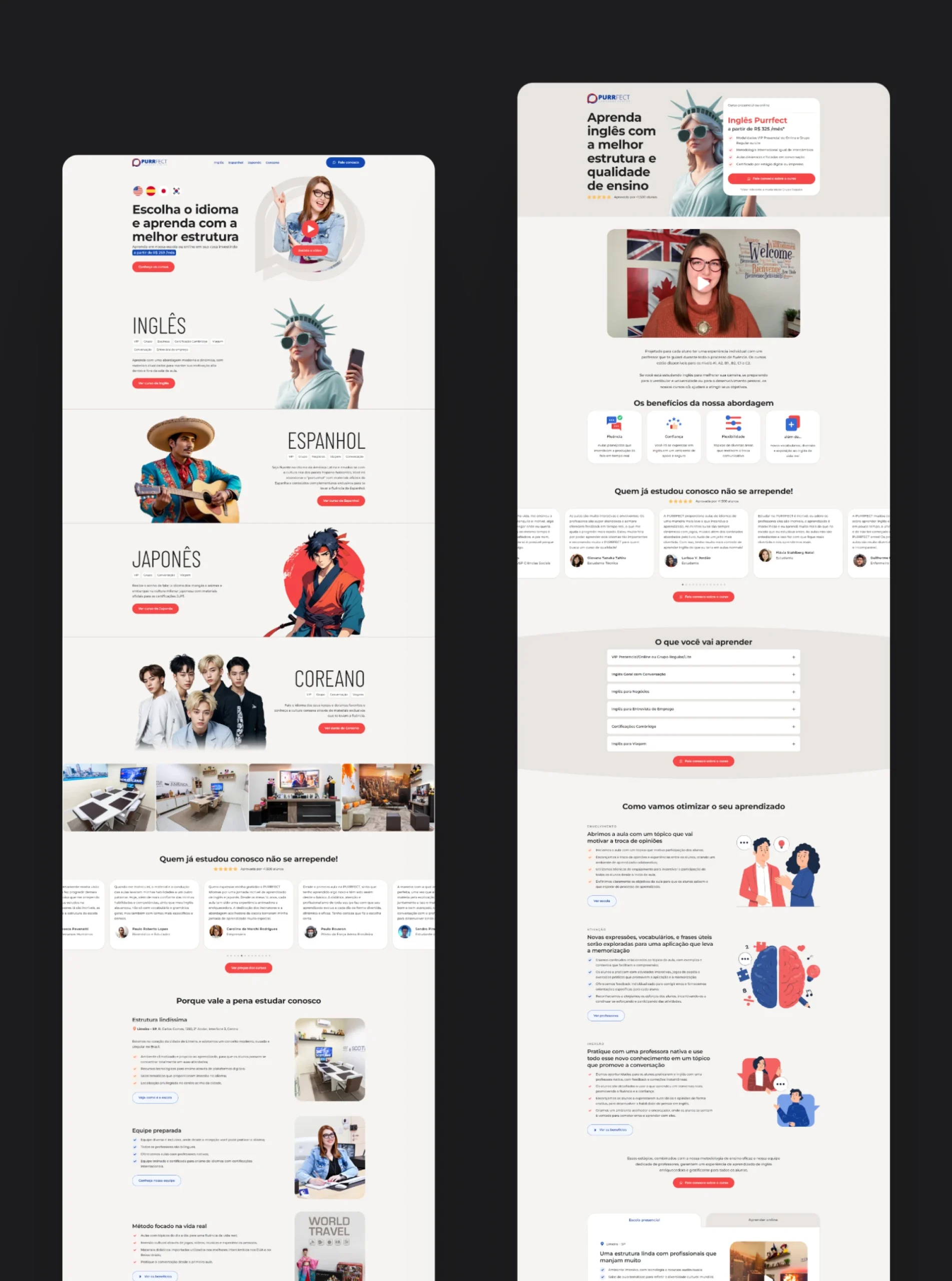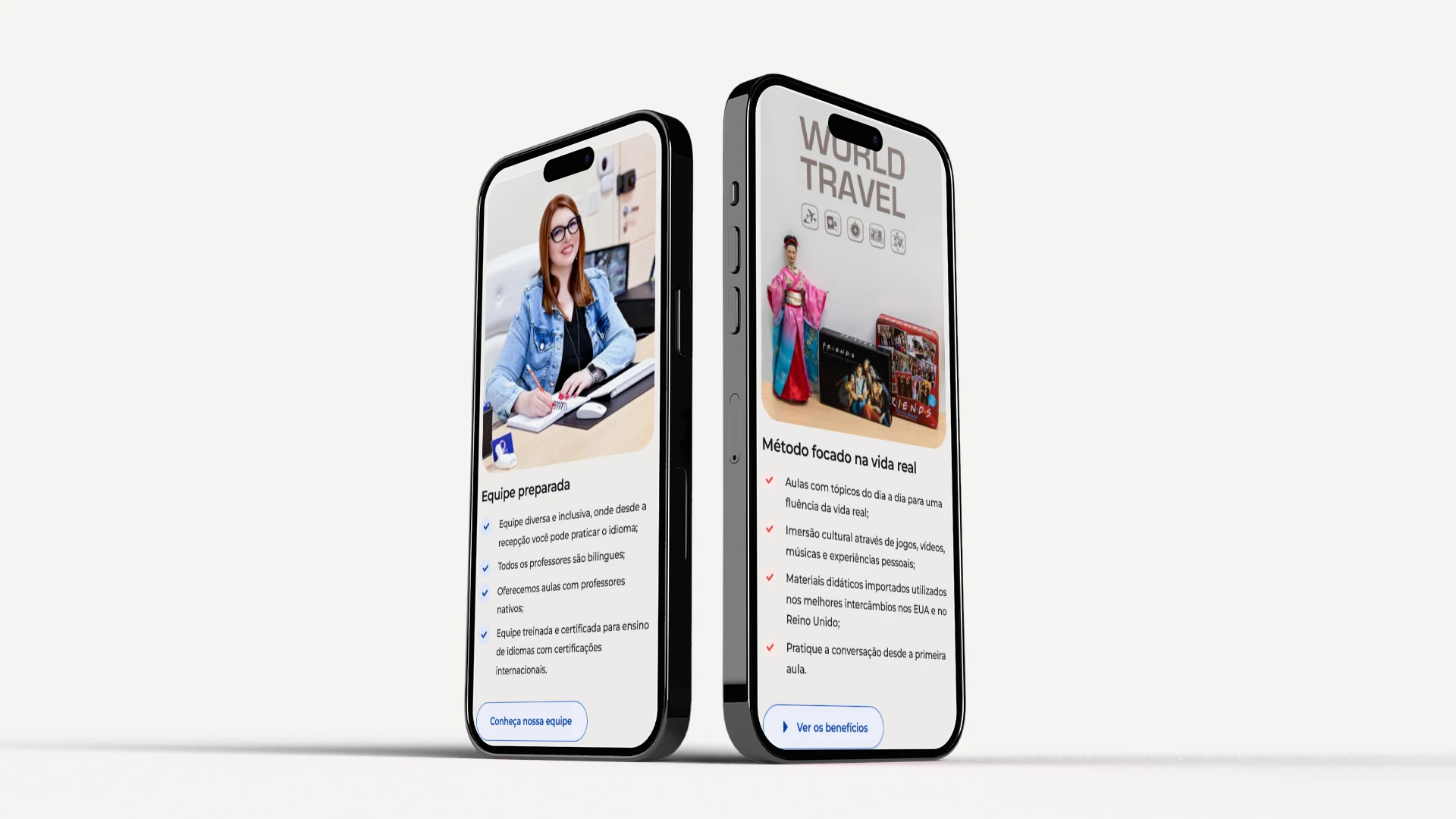 Na primeira página, usamos a homepage juntamente com diversos pop-ups para explicar todos os cursos, destacar a excelente estrutura física da escola por meio de fotos e vídeos atrativos, e apresentar a equipe de professores. A segunda página foi dedicada exclusivamente ao curso de inglês, o principal da escola, que receberá anúncios específicos. Utilizamos inteligência artificial (IA) para criar imagens ousadas que ajudam a estabelecer uma identidade visual única e impactante.