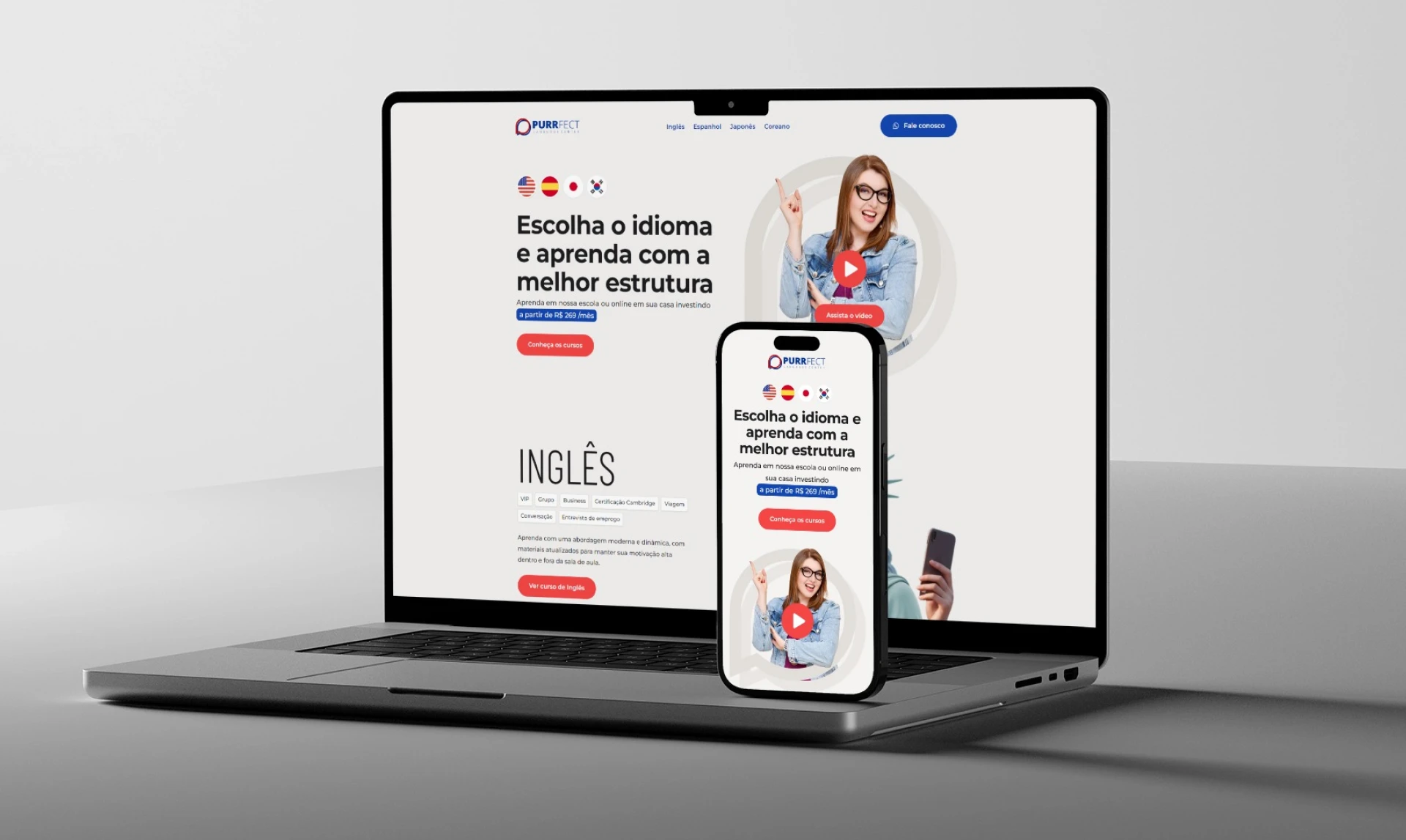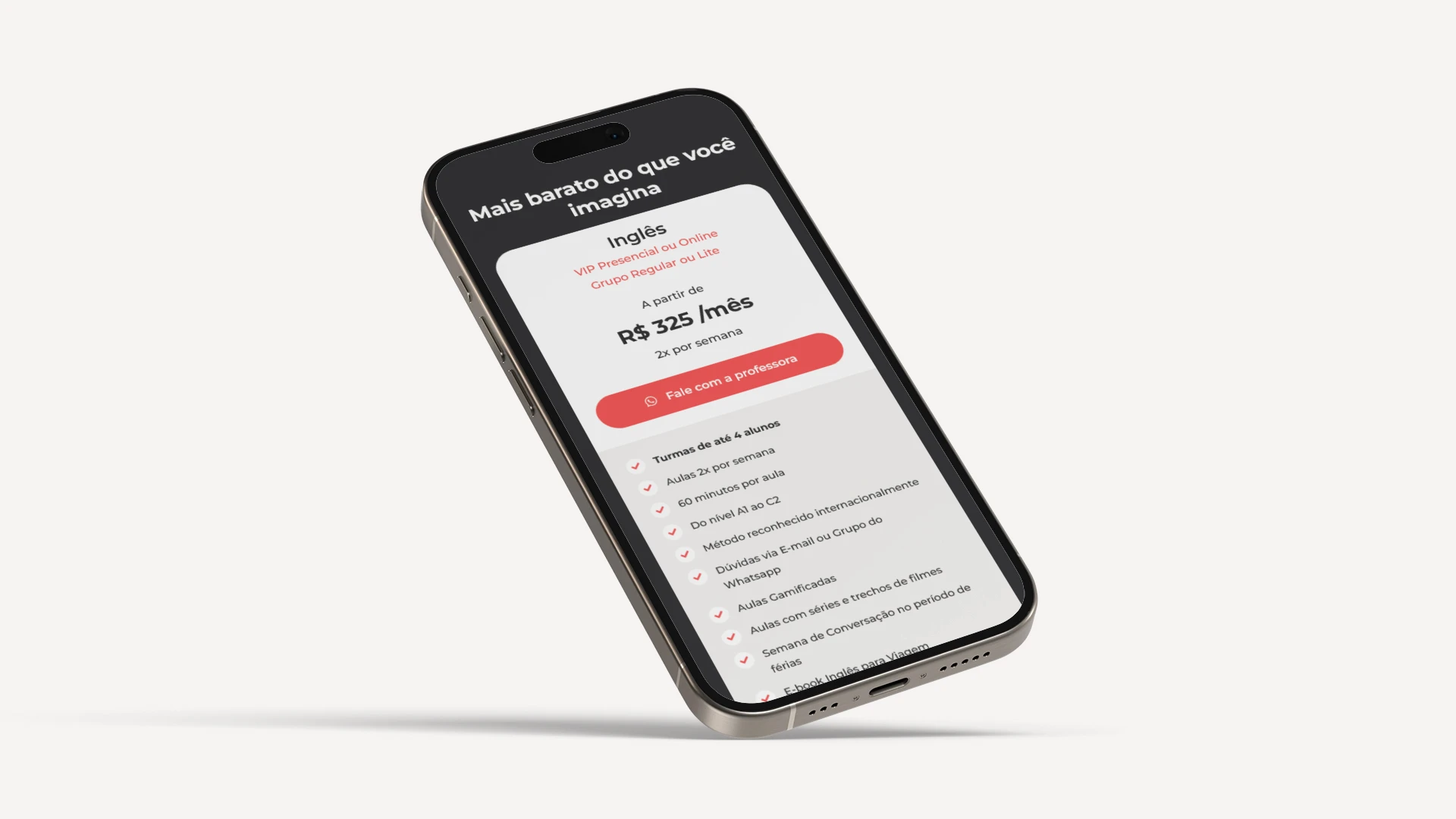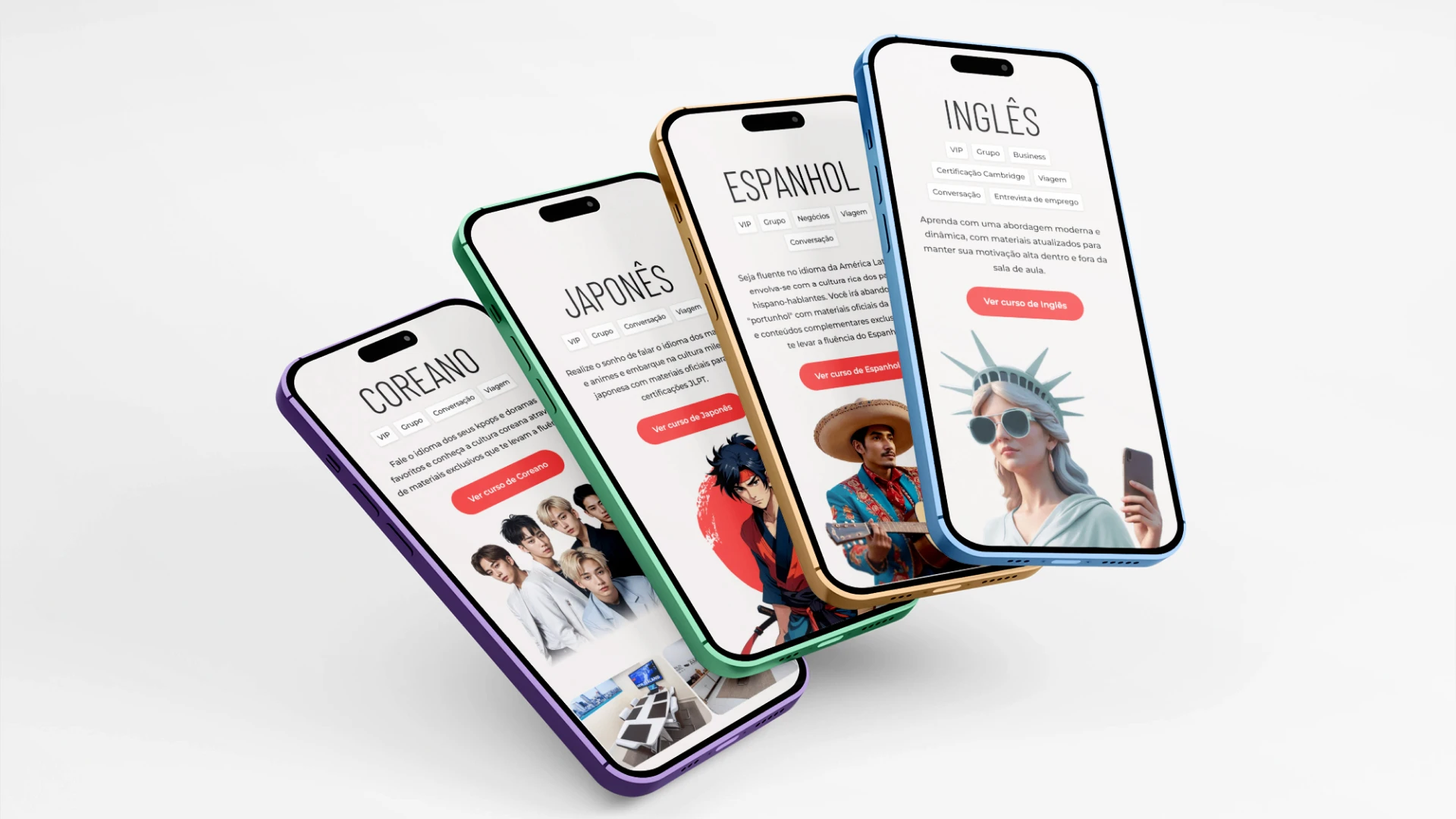 Na primeira página, usamos a homepage juntamente com diversos pop-ups para explicar todos os cursos, destacar a excelente estrutura física da escola por meio de fotos e vídeos atrativos, e apresentar a equipe de professores. A segunda página foi dedicada exclusivamente ao curso de inglês, o principal da escola, que receberá anúncios específicos. Utilizamos inteligência artificial (IA) para criar imagens ousadas que ajudam a estabelecer uma identidade visual única e impactante.