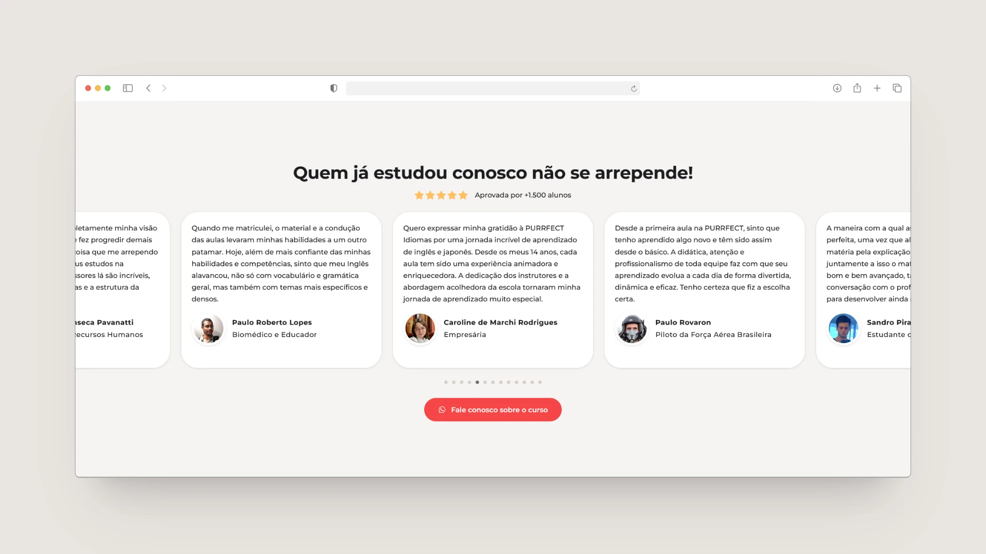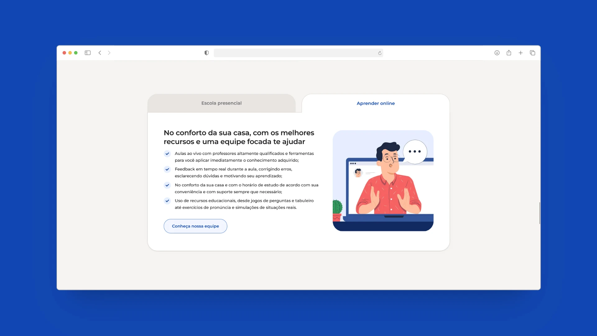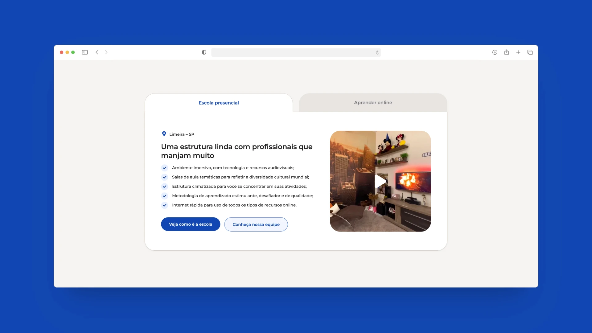 Criar um site para ser utilizado em campanhas no Google e nas redes sociais. O site deveria ter no máximo duas páginas, com uma identidade visual jovem que valorizasse a escola física, ao mesmo tempo em que promovesse os cursos online.